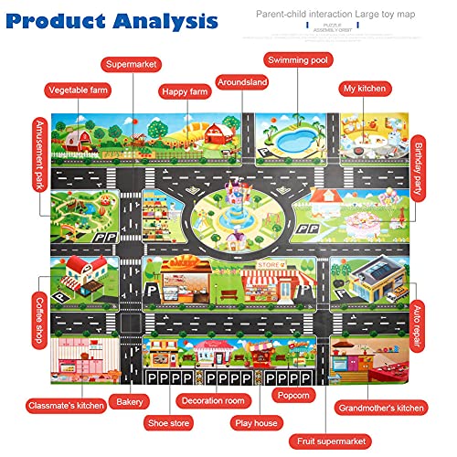 Geef je kinderen een eigen stad, nu kunnen je kinderen hun eigen stad hebben! Hij kan zo veel met vrachtwagens en autospeelgoed spelen als hij wil in deze stad. Met het mooie stadsleven ontwerp van de kaart heb je plezier educatieve tijd met je kinderen!