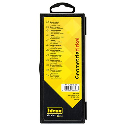 Specification: Idena 20067 – geometriepasser van metaal met 2 gewrichten, inclusief reservevullingen, in etui