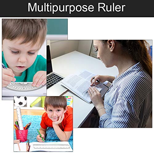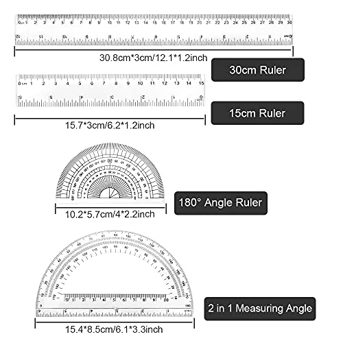 📏 4-delige schooletuimelmaat:☚ Je ontvangt 1 lange liniaal met een lengte van 30 cm, een korte liniaal met een lengte van 15 cm, een afgeronde liniaal met een liniaalschaal onderaan en een 180 graden afgeronde liniaal. Selecteer het gebruik volgens de werkelijke eisen
