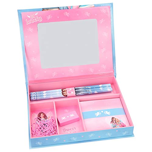 Met de schrijfwarenbox in Topmodel Kitchy Angel design zijn de schrijfgerei altijd opgeruimd en kunnen ze gemakkelijk worden meegenomen. De kist van stevig karton is ca. 20 x 15,5 x 3,2 cm groot en heeft 4 verschillende grote vakken. Hij is al gevuld met 3 potloden, een gum, 25 paperclips en een mini-blok met 100 notitieblaadjes. Onder het deksel bevindt zich een grote spiegel, zodat de box ook voor sieraden of make-up kan worden gebruikt.