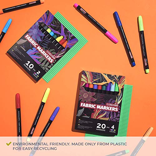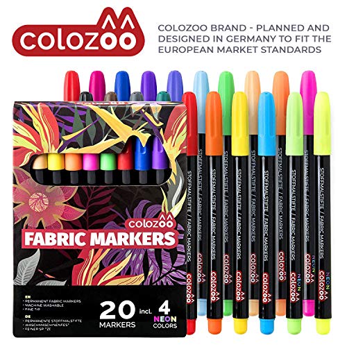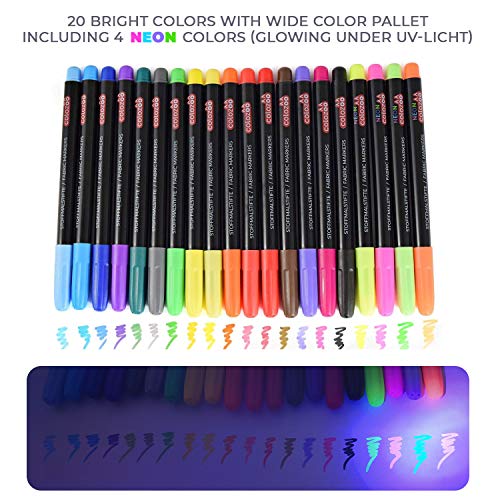 Colozoo Fabric Markeerstiften Wasmachinebestendig | 20 Kleuren, Waaronder 4 UV-Neon Gloeiende Kleuren | Voor T-shirt…