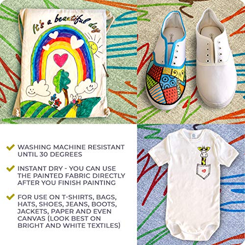 ✏️ VEELZIJDIG GEBRUIK — Kan op verschillende soorten stoffen schilderen; katoen, canvas, jersey, jeans, polyester, leer en meer – Ontwerp je T-shirts, jeansjacks, hoeden, petten, tassen, rugzakken, schoenen, laarzen of wat je maar in je creatieve geest hebt