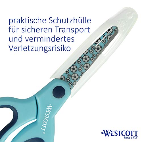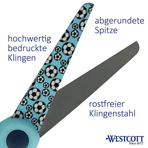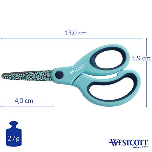 Specification: Westcott Softgrip kinderschaar met voetbalmotief, bedrukt, lemmetbescherming, 13 cm, ronde punt, rechtshandigen, blauw…